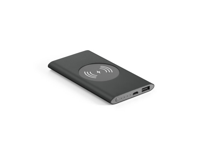 Bateria portátil e carregador wireless. Alumínio. LED: indicador de carga. Capacidade: 4.000 mAh. Tempo de vida ? 500 ciclos. Entrada 5V/2A e saída 5V/2A. Incluso cabo USB/micro USB para carregar a bateria. Fornecido em caixa de oferta. 123 x 70 x 10 mm