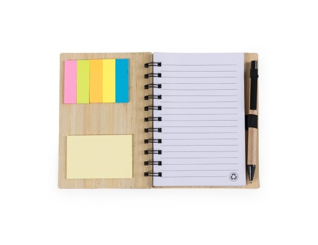 Bloco de anotações ecológico com caneta e autoadesivos. Capa de bambu com uma faixa preta no lado esquerdo e verso liso. Possui cinco blocos autoadesivos coloridos com aproximadamente 20 folhas cada, 70 folhas aproximadamente brancas pa... Ver mais $(document).ready(function(){ $(#ver_maismob).click(function(){ $(#s_ver_maismob).hide(); $(#comment_2mob).show();});});utadas com logo reciclado na lateral inferior. Acompanha suporte elástico de nylon com uma caneta de papelão com acessórios plásticos.