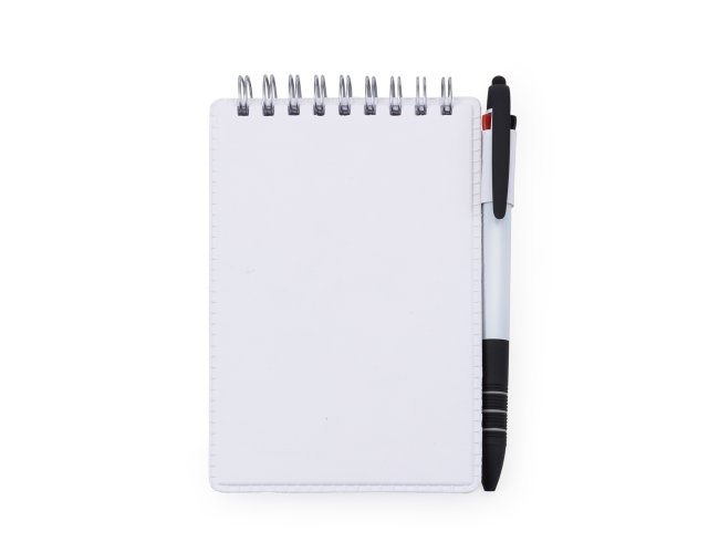 Bloco de anotações de couro sintético com suporte para caneta, frente e verso liso. Abertura superior, possui espiral prata e acompanha aproxidamente 95 folhas brancas sem pauta e suporte na lateral direita para caneta(não acompanha).