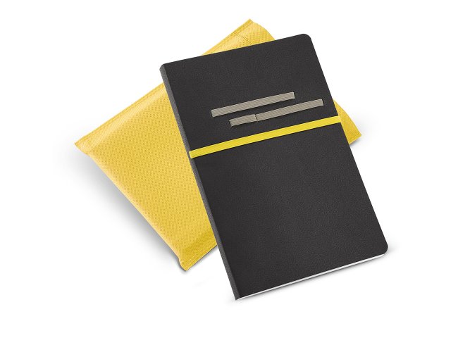 Caderno. C. sintético. Com 96 folhas não pautadas. Fornecido em embalagem de non-woven. Esferográfica não inclusa. 140 x 210 mm
