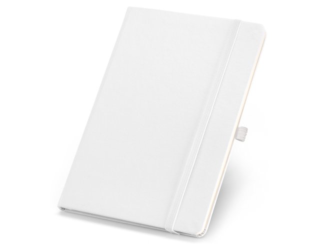 Caderno capa dura. Com porta esferográfica, bolso interior e 80 folhas não pautadas cor marfim. 120 x 180 mm