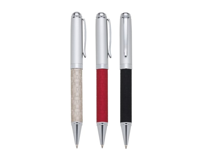 Caneta metal com detalhe emborrachado texturizado. Clip de metal, possui anéis na no detalhe superior, no centro e na parte inferior próximo a ponteira. Aciona por giro.