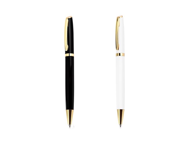 Caneta metal com detalhes em dourado. Clip metálico com anel dourado abaixo, esferográfica aciona por giro.