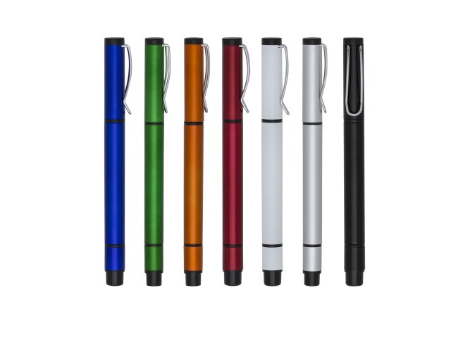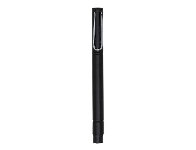 Caneta plástica esferográfica e marca texto, inteira colorida com detalhes preto. Clip de metal, possui tampa de ambos lados. Obs.: Indiferente de cor, todos marca textos são amarelos.
