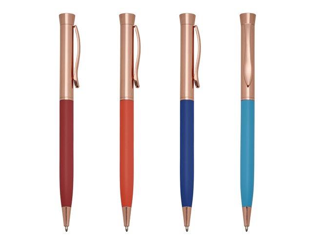 Caneta semimetal com pintura fosca colorida e detalhes em bronze. Clip metálico, acionamento por giro e carga esferográfica azul.