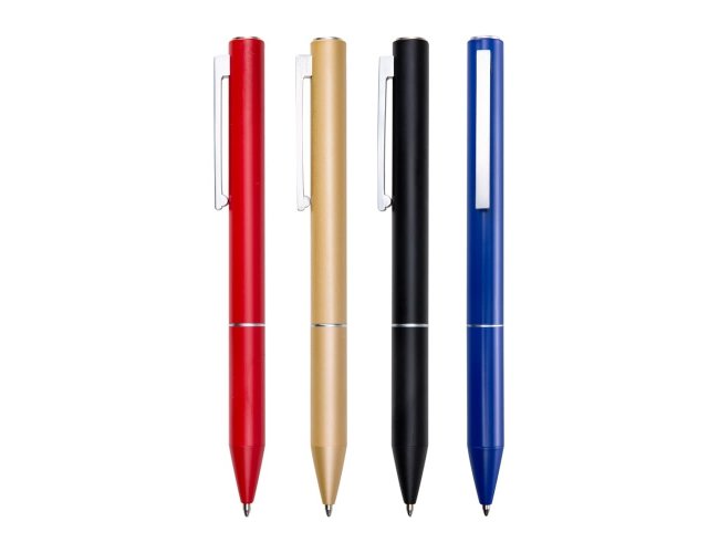 Caneta semimetal colorida fosca com detalhes prata. Clip metal prata fosco, na parte superior da caneta possui um detalhe circular prata e anel prata inferior. Aciona por giro.