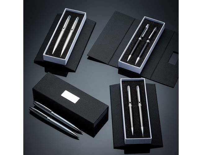 Conjunto caneta e lapiseira em estojo de cartonagem com placa central para personalização. Clip metal com dois anéis em relevo, anel centralizado e dois anéis em relevo na ponteira e acionam por giro. Estojo revestida com espuma na pa... Ver mais $(document).ready(function(){ $(#ver_maismob).click(function(){ $(#s_ver_maismob).hide(); $(#comment_2mob).show();});});rte interna.