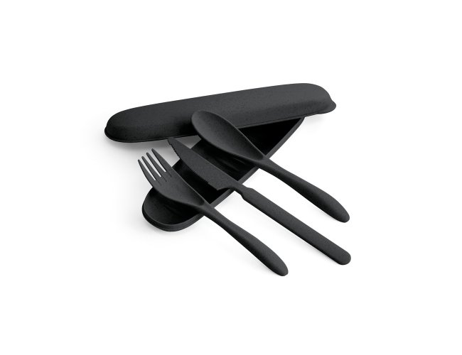 Conjunto de talheres. Fibra de bambu e PP. 3 talheres: garfo, faca e colher. Incluso estojo. Food grade. 205 x 65 x 25 mm