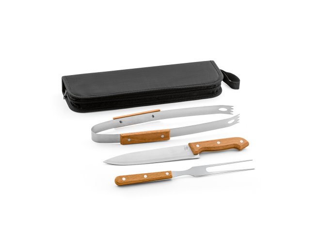 Kit churrasco. Aço inox e madeira. 3 peças em estojo de 210D. Food grad