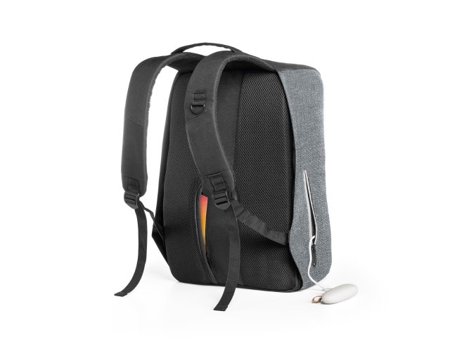 Mochila para notebook. 900D de alta densidade e tarpaulin. Sistema anti-roubo: compartimento principal com zíper oculto e parte posterior com 2 bolsos ocultos com zíper, para maior segurança. Compartimento principal forrado e almofadado, com 2 divisórias almofadadas para notebook até 15.6 e tablet 10.5. Diversos bolsos interiores, incluindo bolso almofadado para smartphone. Presilhas para organização de cabos no interior. Bolso lateral exterior com zíper, com acesso a bolso interior ideal para bateria portátil, facilitando o carregamento de diversos dispositivos. Parte posterior almofadada e sistema de apoio acolchoado para as costas. Alças almofadadas, com 1 bolso com zíper. 320 x 440 x 200 mm