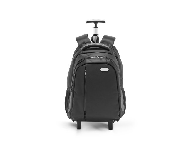 Mochila trolley para notebook. Nylon 999. Material à prova de água. Com 2 rodas. Compartimento principal almofadado para notebook até 17. Segundo compartimento forrado e com diversos bolsos. Bolso frontal com zíper e bolsos laterais com tela. Com protetor de rodas e estrutura removível. Parte posterior e alças almofadadas. Pega extensível em alumínio, com mola (altura da pega estendida até 550 mm). Placa metálica removível com imã, para fácil gravação. Capacidade até 30 L. Peso: 1,70 kg. 350 x 460 x 225 mm