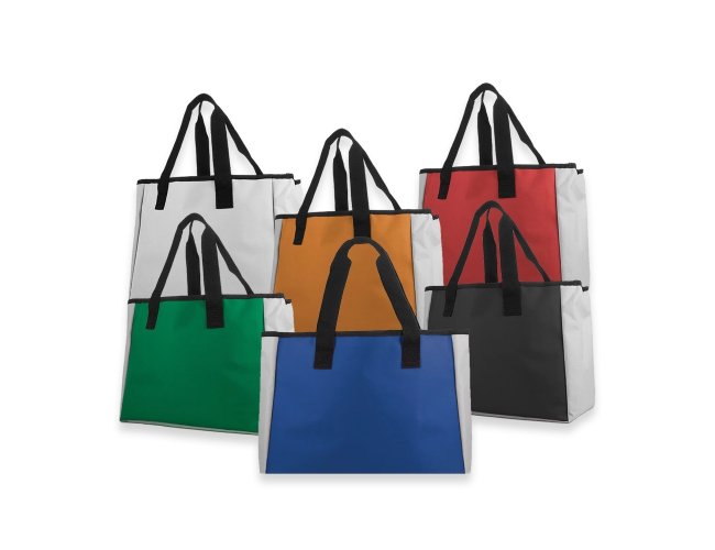 Sacola térmica de poliéster 210D. Possui alças para mãos em nylon, compartimento térmico com zíper e compartimento normal com pequeno bolso de zíper.