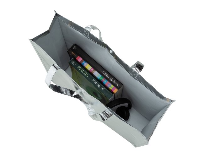 Sacola TNT metalizada com botão. Confeccionado em TNT com revestimento laminado, parte superior possui botão plástico para fecho.