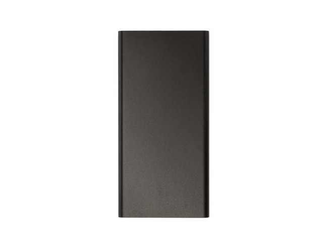 Power Bank metálico com indicador led de bateria. Carregador de metal retangular com bordas arredondadas; laterais plást